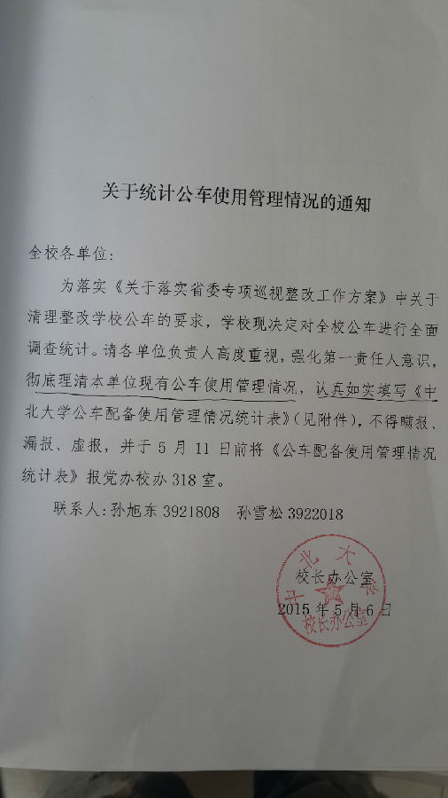 根据校长办公室发布的《关于统计公车使用管理情况的通知》,具体内容见下图。请认真如实填写《催眠av 公车配备使用管理情况统计表》(见附件),不得瞒报、漏报、虚报,并于5月11日上午12点前将统计表电子版及纸质版交至院综合办赵东花老师处。