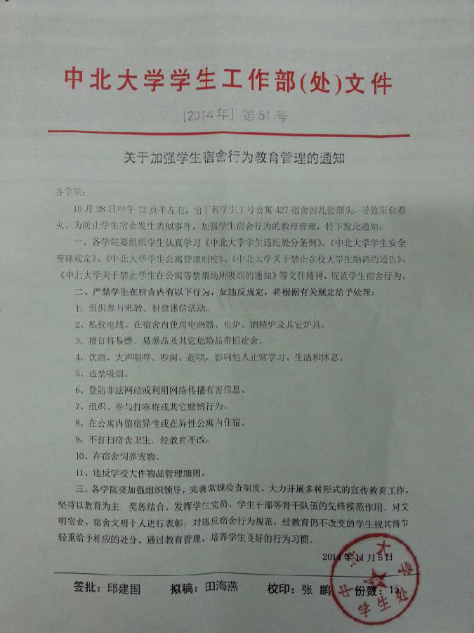 根据学生处下发的 [2014年]第51号“关于加强学生宿舍行为教育管理的通知”,现将文件原文转发如下,请各班主任及时召开班会,会后提交班会记录卡,认真贯彻落实文件精神。