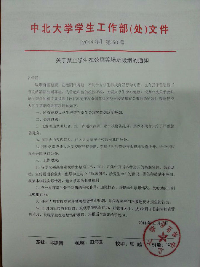 根据学生处下发的 [2014年]第50号“关于禁止学生在公寓等场所吸烟的通知”,现将文件原文转发如下,请各班主任及时召开班会,会后提交班会记录卡,认真贯彻落实文件精神。