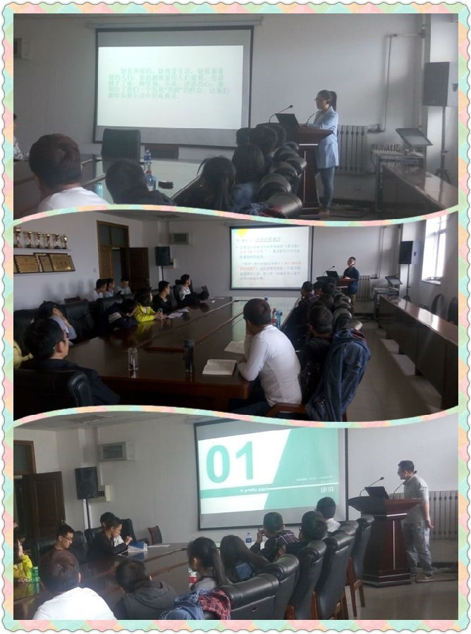 下午三点同学们准时到达现场,在刘老师的主持下,会议开始。在会议上,王艳学姐首先通过对一部励志电影“滚蛋吧,肿瘤君”的感受表达了对即将离开的大学生活以及与同窗分别的不舍。接着孟庆刚学长做了一个以百度为主题的报告,主要讲述了百度创建和历史发展。最后刘旭学长分享了一本他觉得受益匪浅的书,这本书主要讲解了时间的管理,告诫学弟大学四年不能只是浑浑噩噩的混过去,要学会管理时间,这样大学才会过的有意义。会议结尾刘文怡老师总结了此次会议三个大四学长的分享都做的特别好,既表达他们对大学的总结,又有对学弟学妹的劝诫和勉励。