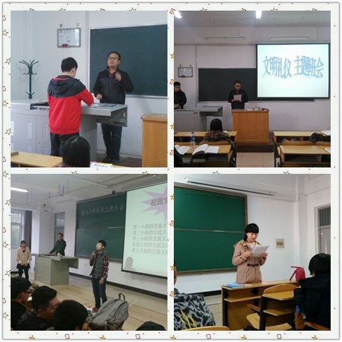 的“服务之星”获得者——袁华老师做“公共场所文明礼仪”主题班会。袁老师结合当前大学生的实际情况、校园的文化建设以及当前世界发展对人才的需求,从爱国、集体意识、感恩、校园文化建设、学习等多个方面表达了对“文明大学生”的看法,并对同学们提出几点要求:积极改掉不文明的行为习惯,学会感恩,做好身边的每个小事情,广交朋友、注重学习。