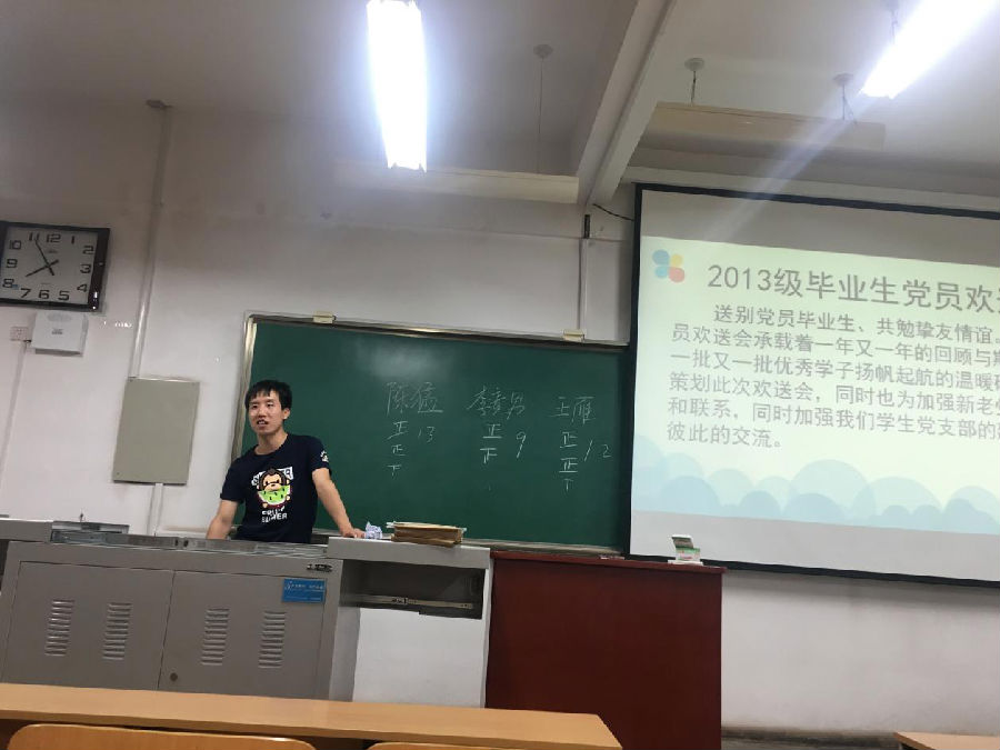 2016年5月31日晚上7点,研究生第三支部召开支部大会送别党员毕业生、共勉挚友情谊。会议由支部副书记郭淳主持,支部全体党员、重点发展对象和入党积极分子参加了本次会议。
