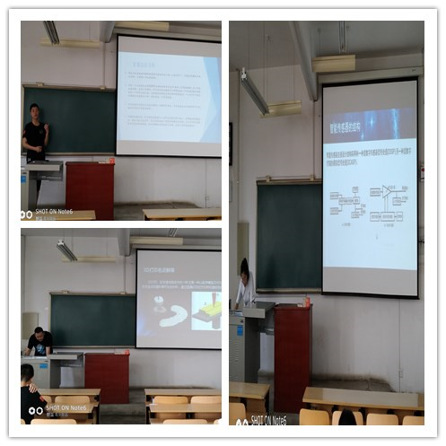 在此次学术交流活动中,王雯凤同学详细讲解了《浅析智能传感器及其应用》,同时在讲解中认真向同学们介绍了自己对于智能传感器的发展前景的展望。接下来于亮同学向大家介绍了《3D打印技术》,在讲述中于亮同学或旁征博引,或慷慨激昂,讲述的内容激起了大家浓厚的兴趣。最后登上讲台的芦哲同学介绍了《陀螺仪及应用》。芦哲同学对于陀螺仪的知识有很深的理解,深入浅出地陈述了陀螺仪在我们周围身边广泛的应用,赢得了大家的阵阵掌声。