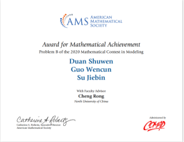 2020年,获美国数学学会特别奖(AMS奖,每年仅授予所有O奖中的3支队伍)