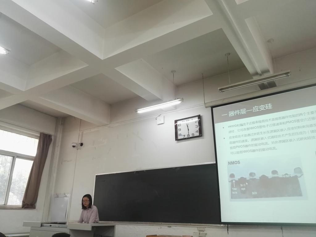 主要负责工艺研发的徐惠芬老师给大家介绍了IC工艺制程发展,具体分析了器件层、介质层、金属互连层、短沟道效应、全耗尽绝缘层等工艺中的常见问题和目前的发展。老师还通过手机芯片、智能手表等实例为我们做了详细讲解以及多Fin晶体管如何实现高性能、FinFET结构和Fin的生长等都做了介绍。