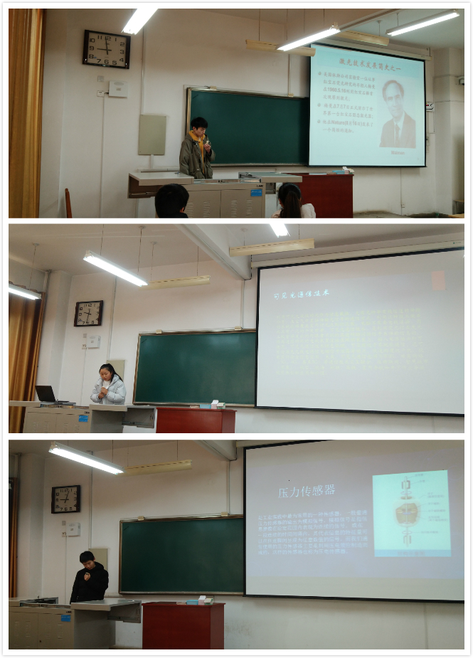 在此次学术交流活动中,杨承志同学详细讲解了《激光发展史》,王靖文同学向大家介绍了《可见光通信》、杜伊尧同学介绍了《我们身边的传感器》,侯姝悦同学分享了《太阳能电池的研究》。