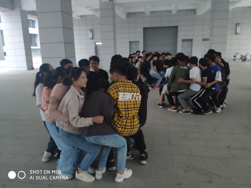 最让人动容的是最后一个项目,万里长城。同学们排成圆圈,每人坐在后一位同学的腿上,并保持稳定。刚开始时大家游刃有余,慢慢就有些同学体力不支。为了鼓舞全体同学的士气和凝聚力,同学们自发高唱校歌《再创辉煌》,鼓励队友坚持。