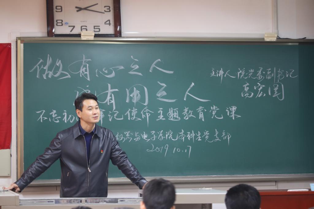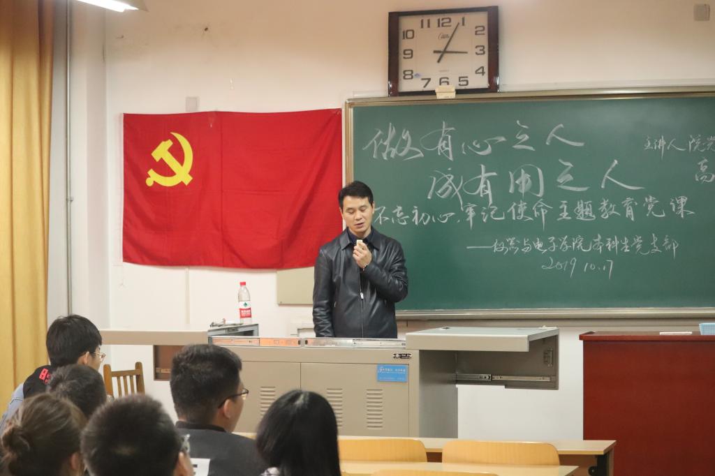10月17日下午,仪器与测控本科生党支部组织了测控支部和电科支部的本科生党员、预备党员参加了由院党委副书记高宏图主讲的关于“不忘初心、牢记使命”的主题教育党课,在党课中就学习怎样做有心之人,成有用之人这一课题进行了深入讲解。活动由电科支部副书记安达人主持。