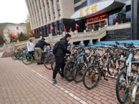图书馆前开展了以“有序停车、美化校园”为主题的整理乱停乱放自行车的志愿者活动。