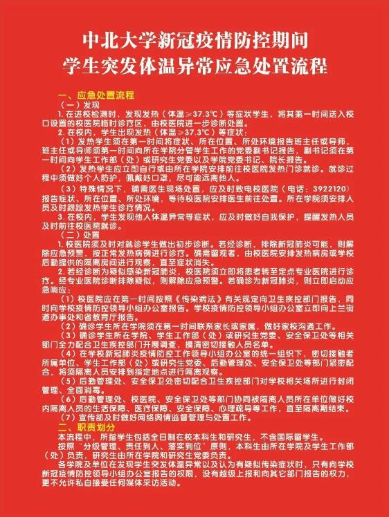 新冠疫情防控期间在校学生突发体温异常应急处置流程》并下发文件,明确发现、处置2个阶段、10个处置环节人员到位、措施到位、衔接有序、上下贯通。近期,学校将组织全校应急处置全景演练,进一步提高应急处置能力,做到应急处置不慌乱。