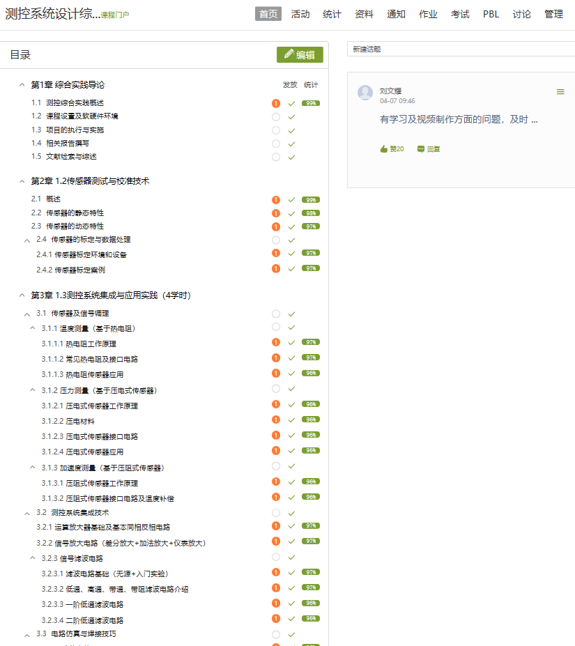 及专业负责人的指导下,刘文耀、曹慧亮、高晋阳三位老师提前录制搜集了大量学习资料,并通过学习通软件完成了本课程的网络建设。从2020年4月7号到4月11号,刘文耀、曹慧亮、高晋阳三位老师分别以“实践模块概论”、“传感器测试与校准技术”、“测控系统集成与应用实践”为主题,通过学习通软件进行了网络授课。授课期间,学生通过学习通软件进行线上签到,通过微信群进行线上答疑,二百余名测控专业学生进行了线上学习,网课参与率达到98%以上,整个授课过程井然有序。
