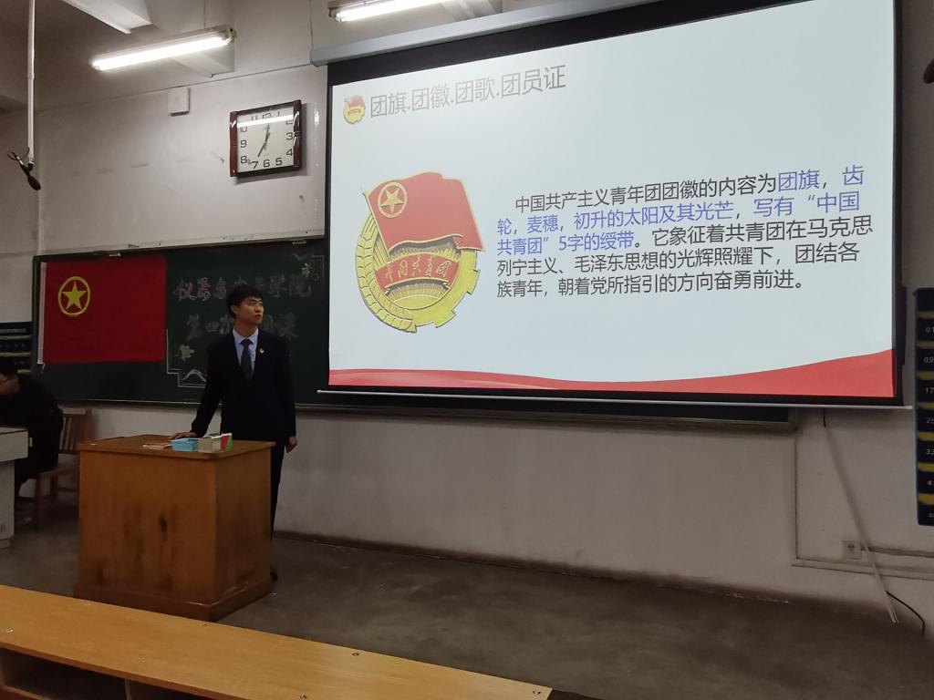 首先上场的是20060409团支部的团支书,他认真的讲述着中国共青团的历史及组织原则,在他慷慨激昂的讲解中,同学们听得入神,眼神中透露着对团的热爱与对人民服务感到光明,最后还提到了团纪律的自觉性和强制性,在两者的对比中让同学们更加深刻的了解了共青团的知识。