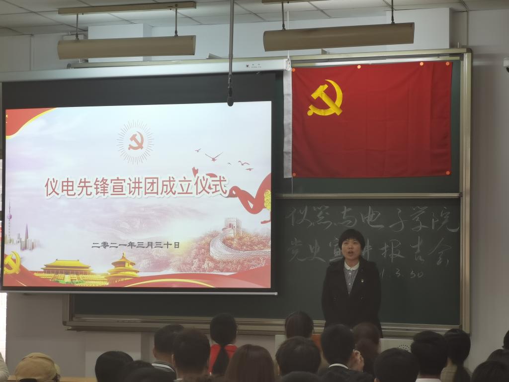 杜瑞平书记为仪电先锋宣讲团成立仪式致辞,为宣讲团授旗,宣讲团团长张琦琪接旗,标志着仪电先锋宣讲团成立。