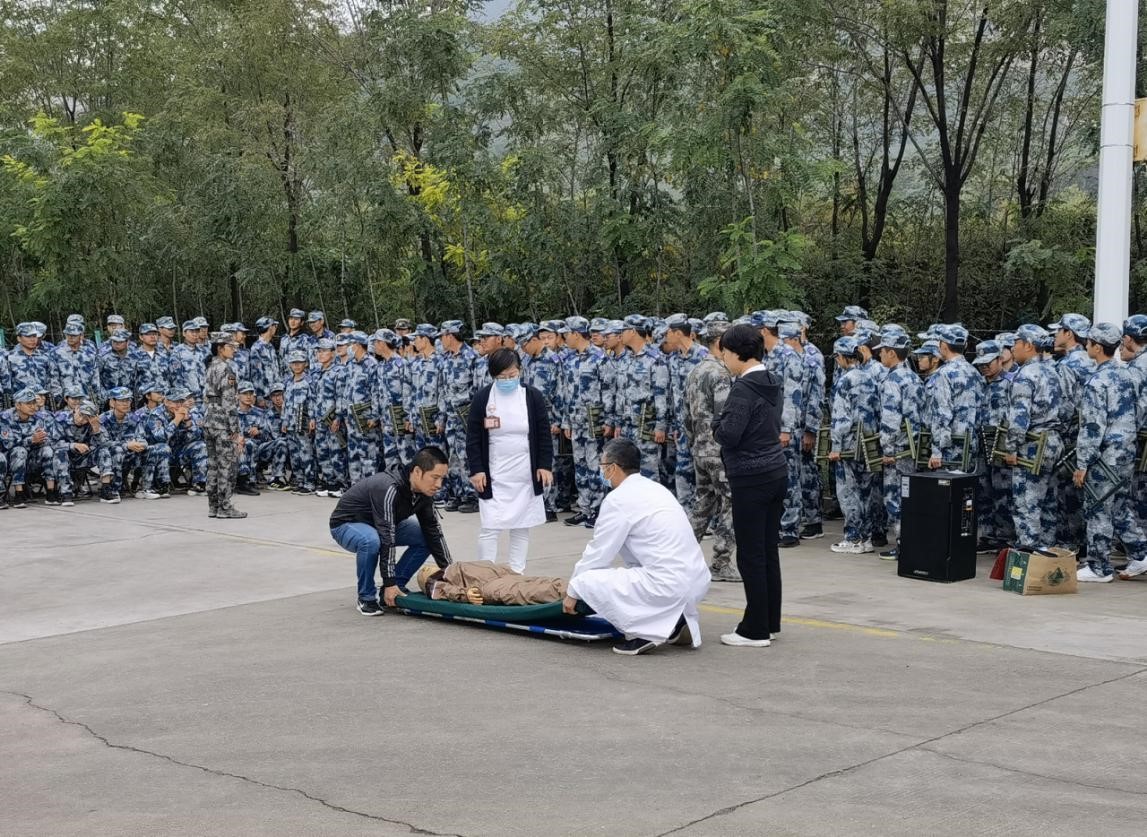 健康教育现场教学:校医院主任勾虎平、护士长尹慧芳在消防灭火演练后,给军训场上的师生们也带来了急救知识的讲解和示范。医护人员为同学们讲解心肺复苏的急救知识,以便在等待救护车的黄金时段可以正确实施初步救援。“手掌按压在胸骨下端!”医护人员以行动来讲解的方法,为同学们详细地介绍了如何判断病人是否存在生命体征,赢得了同学们的一片掌声。在医护人员的专业指导下,同学们初步掌握了心肺复苏,人工呼吸等急救知识,并树立了把急救知识运用到实践当中的意识。