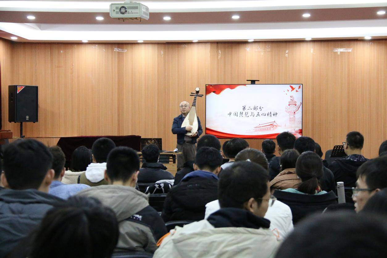 演奏硕士、美国中田纳西州立大学访问学者田军教授。讲座中,田教授用琵琶音乐的形式呈现党的百年非凡奋斗史,抒写了红色记忆。他将自己从事琵琶事业多年的感悟和经验进行梳理、总结,站在中国最具代表性的民族乐器琵琶音乐文化视角,围绕中国共产党人的精神谱系,以中华优秀传统文化的人文精神为底蕴,立足音乐艺术教育的责任担当,以讲演结合的形式,精选百年经典力作,现场示范,将历史性与艺术性高度融合,回顾历史、跨越时空,赓续中华文化血脉,凝聚民族音乐力量,展现琵琶音乐中的中国精神。