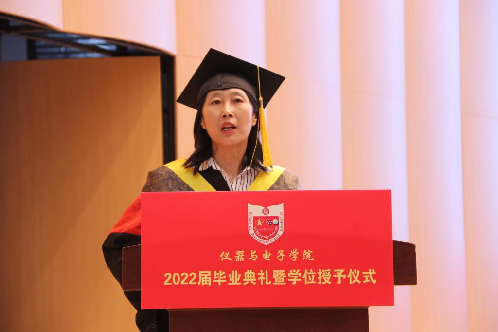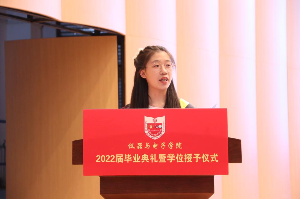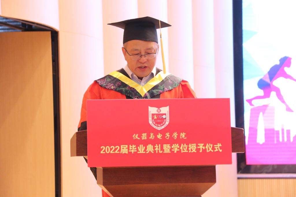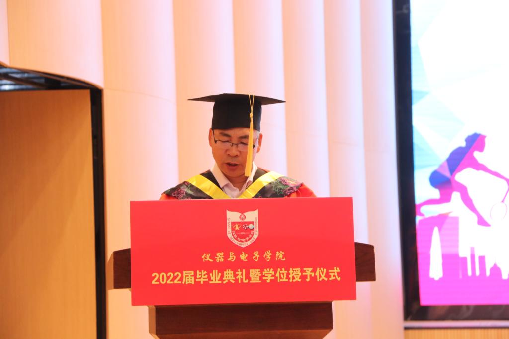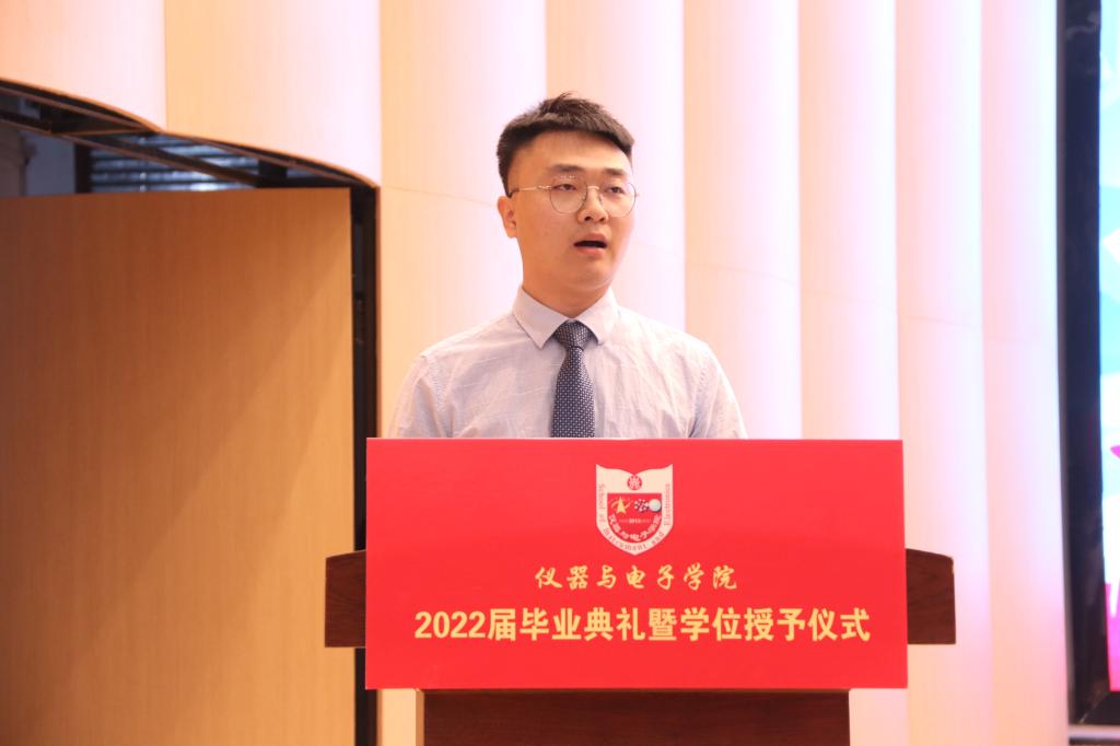副院长唐军宣读学位获得者名单。毕业研究生代表关一浩和毕业本科生代表安琪分别代表毕业生们向学校和辛勤付出的老师们致以诚挚的感谢。