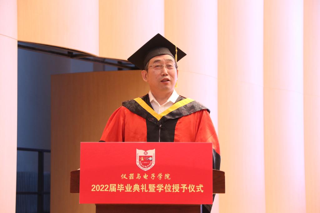 副校长刘俊教授发表毕业致辞,他向顺利完成学业的毕业生们表示祝贺,向即将离开母校,走上工作岗位或继续深造的毕业生同学们送去美好祝愿,同时提出三点希望,希望同学们有奉献精神,树立责任担当;沿袭“精益求精”的工匠精神,时刻以追求卓越的目标自我鞭策;勇敢面对困难,活出自信的人生。