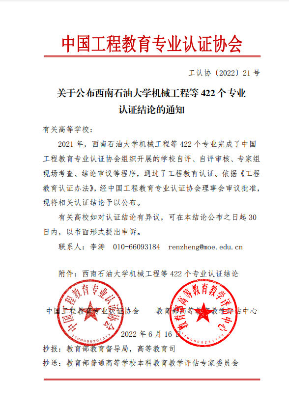 6月16日,中国工程教育专业认证协会和教育部高等教育教学评估中心联合发文《关于公布西南石油大学机械工程等 422 个专业认证结论的通知》(工认协〔2022〕21 号),正式公布了2021年工程教育专业认证结果。本年度共有422个工程教育认证。催眠av