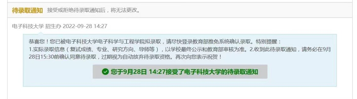 大三暑假的时候,我报名参加了一些夏令营,每当我参加夏令营宣讲的时候,我都会对自己说,这个我真的可以吗,当时自己也很焦虑,所幸在推免之路上有很多好友一起前行,可以互相倾诉缓解压力,也有很多优秀的学长学姐帮助自己解疑答惑,在他们身上我汲取到了很多力量,通过向他们学习,我在推免之路上不断地完善自我,变得更有自信,最终夏令营和预推免的结果也算理想,先后拿到北京航空航天大学、天津大学、中科院微电子所、东南大学、西北工业大学、哈尔滨工业大学等院校优营和offer,经过考虑最终选择了电子科技大学。
