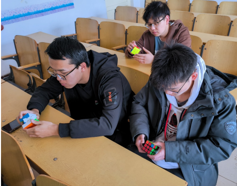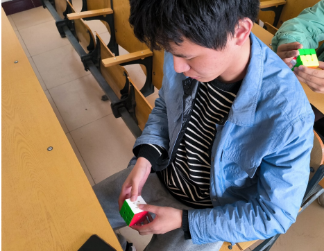 Speed Cube兴趣小组举行三阶魔方初赛。在上学期的三阶魔方教学的基础上,兴趣小组举行三阶魔方比赛初赛。比赛当天,所有参赛选手早早地来到了赛场,大家都摩拳擦掌、跃跃欲试。此次比赛在小组内比拼,由小组长担任裁判,对组内每位到场的同学进行计时。首先由组长李昊晟的小组来打样进行比拼,其他小组的成员观看。每位同学进行一次三阶魔方的复原,由复原所需要的时间最短的同学胜出。