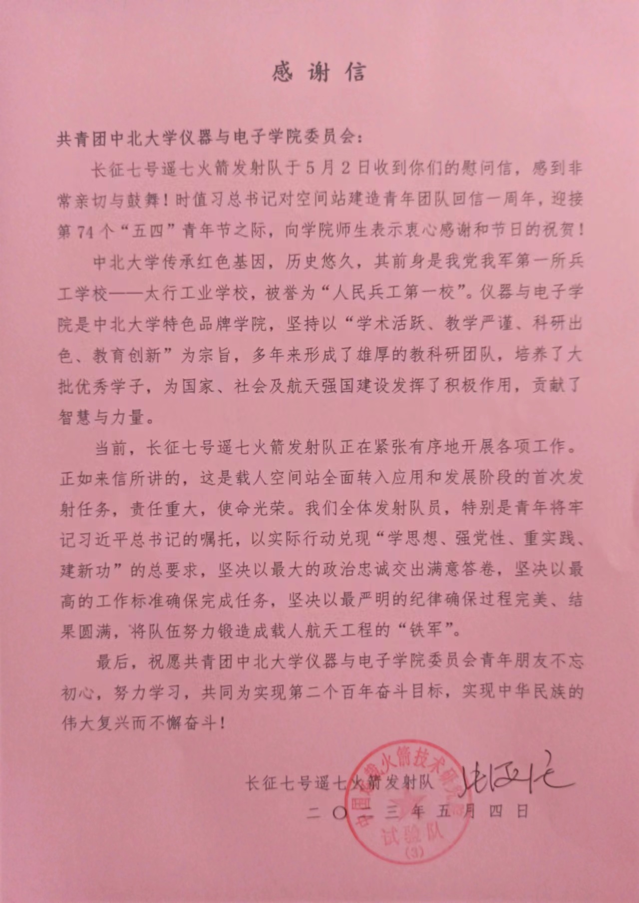 团委代表全体师生向长征七号遥七火箭发射队送去慰问信,并致以崇高敬意。