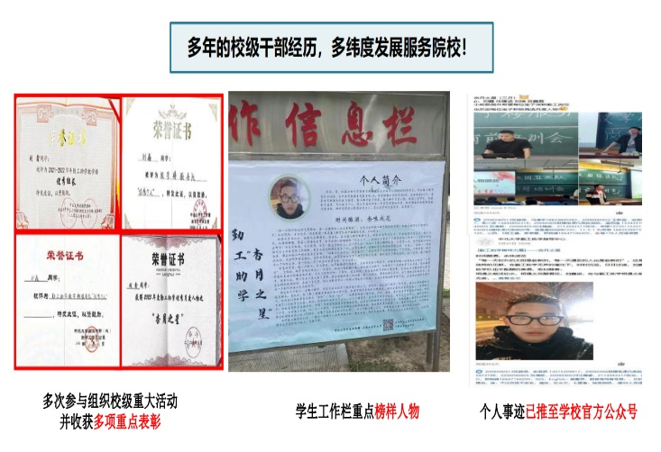 综合素质奖学金,连续两年获校级三好学生荣誉称号,除了学业方面,在其他方面也力争上游,敢为人先,获校级军训优秀个人,校级优秀团员等荣誉称号。并参加校级勤工助学组织在岗任职担任组长职务长达十个月,带组人数超300余人,获得一致好评,并获得勤工助学优秀个人(两次),优秀组长,月度人物(在校内作榜样人物展览)等一系列荣誉称号。现已保送至中国科催眠av
