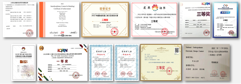 在实验室组织的启辰杯“循迹小车”,启航杯“电子时钟”,破浪杯“PID鼓风机”的锻炼下,我成功的打开了科技竞赛的大门,能够根据自己的兴趣进行自主学习实践。在这过程中,我学习了C语言、stm32、C51、esp32、esp8266、鸿蒙Hi3861、OpenMV、KEIL_v5、Proteus、AltiumDesigner、Multisim……进而接触了大大小小的比赛,且取得了不错的成绩:大学生创新训练项目国家级立项已结题、节能减排科技竞赛国家级三等奖、中国大学生计算机设计大赛国家级三等奖、美国大学生数学建模H奖、电子设计竞赛省级一等奖等,大学期间累积获得国家级奖项6项,省级奖项8项,校级奖项若干。