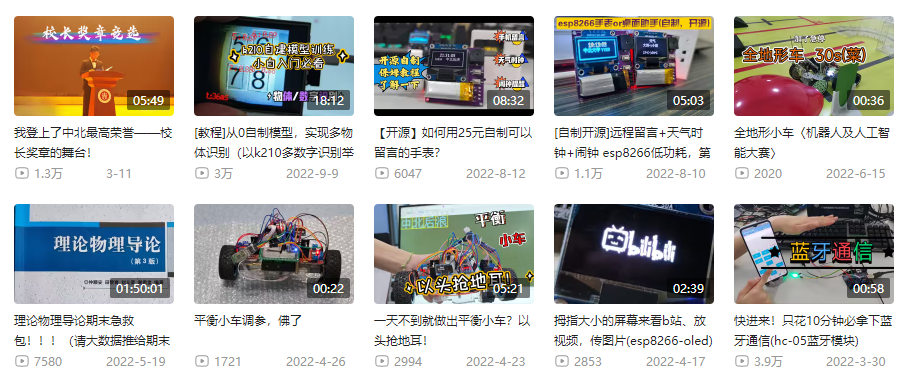 此外还有很多项目也是基于兴趣和求知欲的驱动下,从而沉浸其中。包括:“平衡小车”、让我学到了 PID 闭环控制;“激光跟随控制系统”让我学到了视觉图像处理与复杂控制逻辑;“智能污水处理系统”和“自制智能手表”让我学习了物联网芯片:esp8266、Hi3861 的使用与物联网远程控制的方法;“智能家居视频小车”让我学习了 linux 操作系统的开发方法、4G 无限远控制运动与视频流传输......这一切大大小小的项目实践,都使我对电子系统软硬件设计深感兴趣。