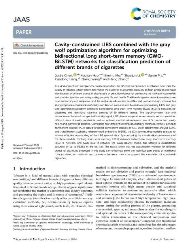 郝晓剑教授“中仪迅辉”科技团队在激光诱导击穿光谱理论机理及应用分析领域取得重要进展,原创工作以“Cavity-constrained LIBS combined with the gray wolf optimization algorithm for optimizing bidirectional long short-term memory (GWO-BiLSTM) networks for classification prediction of different brands of cigarettes”为题,发表在国际著名期刊Journal of Analytical Atomic Spectrometry(IF=3.1,光谱学1区)上,并入选该期刊Back Cover(封底论文)。郝晓剑教授为论文通讯作者,硕士研究生陈浚杰为论文第一作者。该项研究获得了国家自然科学基金面上项目、山西省重点研发计划等多项资金的资助。