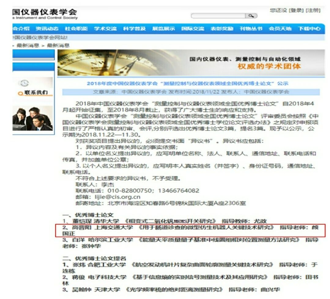 青年教师高晋阳的博士学位论文《用于肠道诊查的微型仿生机器人关键技术研究》获此殊荣。