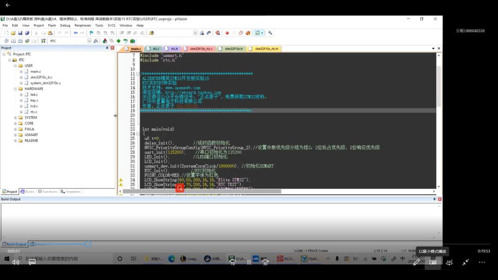本次培训主要讲解了之后比赛可能会用到的RTC时钟实验,按键实验,屏幕显示等内容,介绍了一些简单的例程、功能函数等,了解了如何设置按键去实现一些功能,并且帮助解决了同学们在先前学习过程中遇到的一些问题等,最后带领大家重温了上节课的内容。