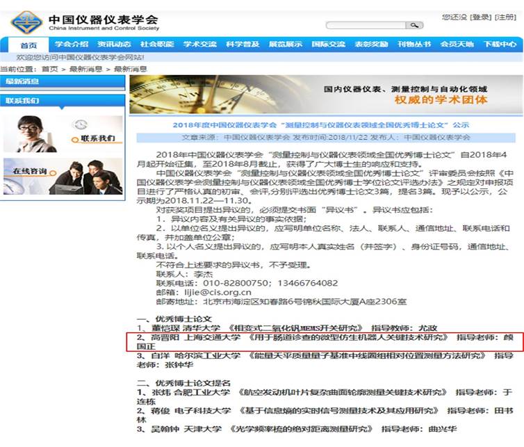 青年教师高晋阳的博士学位论文《用于肠道诊查的微型仿生机器人关键技术研究》获此殊荣。