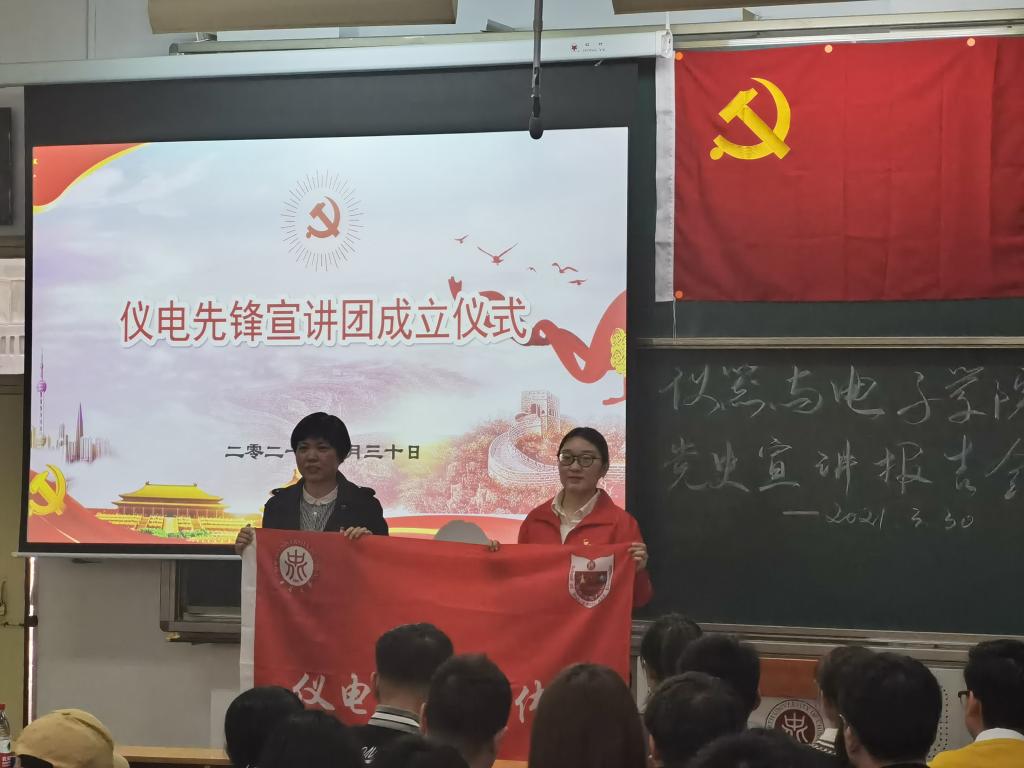 杜瑞平书记为仪电先锋宣讲团成立仪式致辞,为宣讲团授旗,宣讲团团长张琦琪接旗,标志着仪电先锋宣讲团成立。