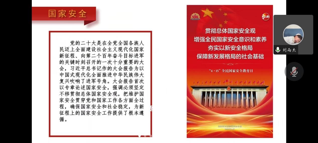 党委和各支部围绕“贯彻总体国家安全观,增强全民国家安全意识和素养,夯实以新安全格局保障新发展格局的社会基础”这一主题,开展观看了关于“网络安全”“生态安全”“资源安全”“核安全”“海外利益安全”“太空安全”“深海安全”“极地安全”“生物安全”等国家安全教育日主题视频,学习了习近平总书记就贯彻总体国家安全观提出“十个坚持”、《中共中央关于党的百年奋斗重大成就和历史经验的决议》提出的“五个统筹”、总体国家安全观五大要素、总体国家安全观五对关系等国家安全知识。