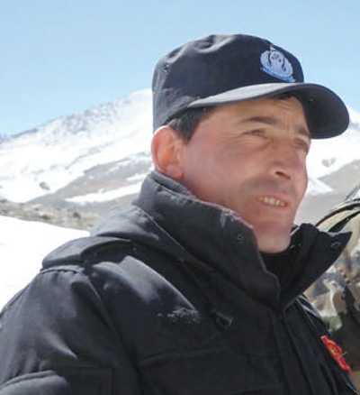 在新疆红其拉甫边境线上,拉齐尼·巴依卡在巡逻途中。