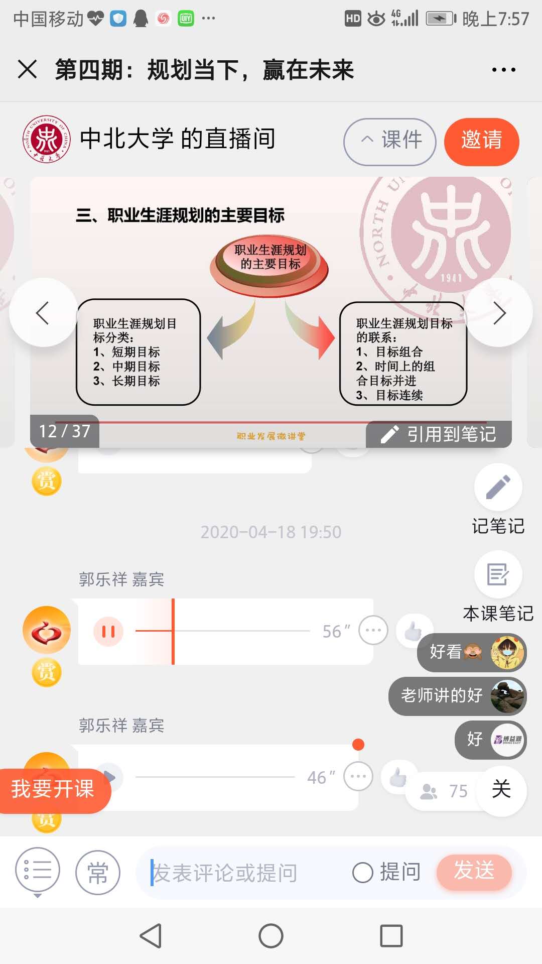 第九届校长奖章的优秀学生事迹入手,鼓励学生及早树立职业生涯规划的意识、尽快掌握科学的规划方法,保持生涯规划的积极心态,在不断的学习实践中调整规划,形成规划——实践——再规划——再实践的良性循环;在知己知彼的环节中,授课教师讲解了影响职业生涯规划的内在因素,勉励学生们尽早剖析自我、认识自我、完善自我,将清晰的自我分析做为职业生涯规划的重要基础;在大我与小我的环节中,授课教师讲解了影响职业生涯规划的外在因素,引导学生们将生涯规划与社会需求相结合,将个人发展与祖国建设相结合,在实现中国梦的伟大奋进中实现自身的人生价值、升华人生境界。