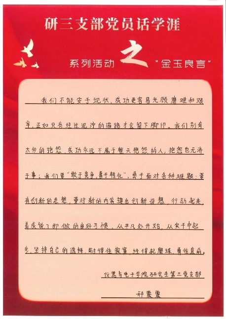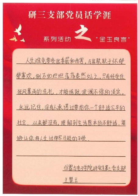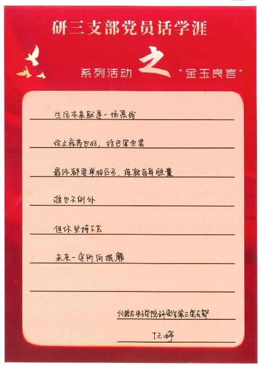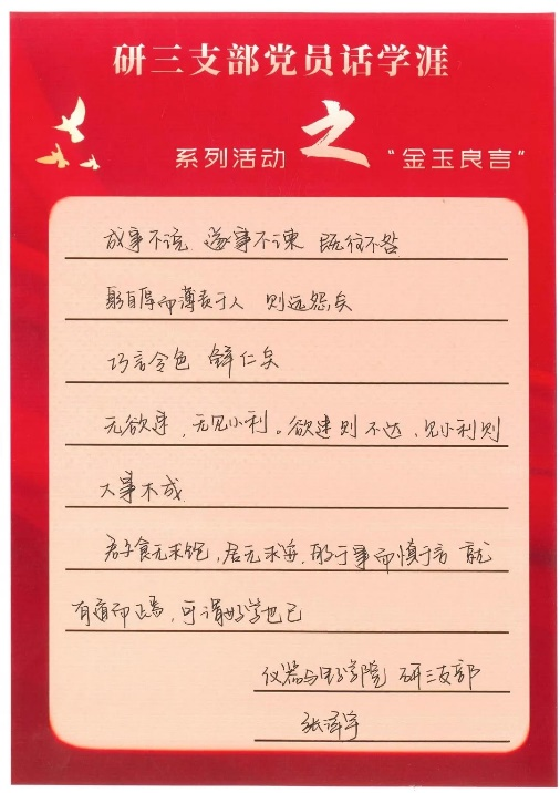 研三党支部全体党员开展了“金玉良言”主题活动,每位党员为低年级的同学书写学业上的正向的建议和经验指导。
