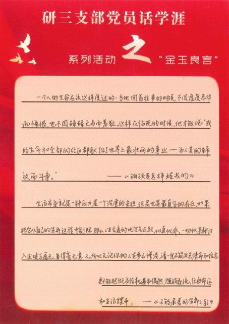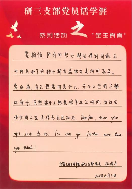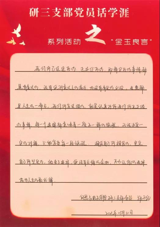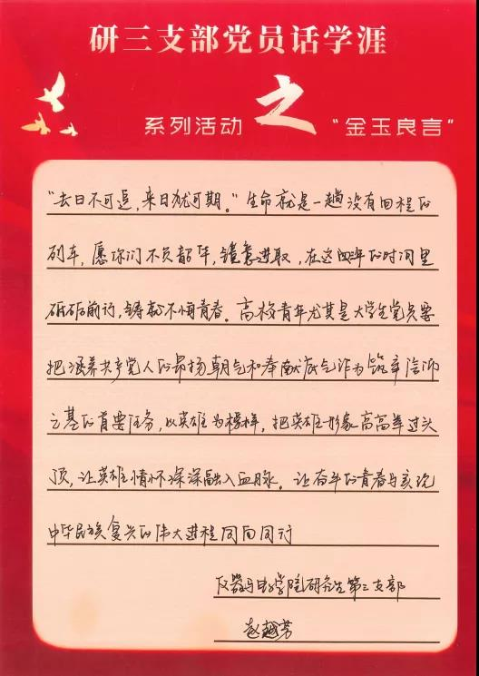 研三党支部全体党员开展了“金玉良言”主题活动,每位党员为低年级的同学书写学业上的正向的建议和经验指导。