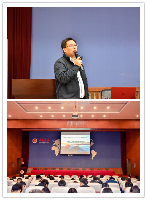 丑修建老师以 “求学之路须用心经历,且行且珍惜”为题,从自己的亲身经历出发为大家分享了自己从求学到工作积累的人生经验与感悟。他以“教”字开题,它所包涵的“孝道”和“文化”意义,告诉同学们在大学时期学生应该学习什么、老师应该教授什么。他认为大学是文化传承、思想洗礼的场所,大学教师应当以“立德树人”为根本,为学生传道、授业、解惑;大学教育应注重塑造灵魂、塑造生命、塑造新人,培养德智体美劳全面发展的社会主义建设者和接班人。同时,他通过分享自己的经历,告诉大家 “做人应该知足、做事要知不足、做学问要不知足”。他用“气度影响格局,细节决定成败”这句话引出了三个问题:何为气度?何为格局?何为完美?并一一为同学们进行讲解,告诉大家要丰富阅历,用心经历。最后他用“自强不息,厚德载物”勉励同学们,要勤奋刻苦学习,提高自己的实力,培养良好德行。