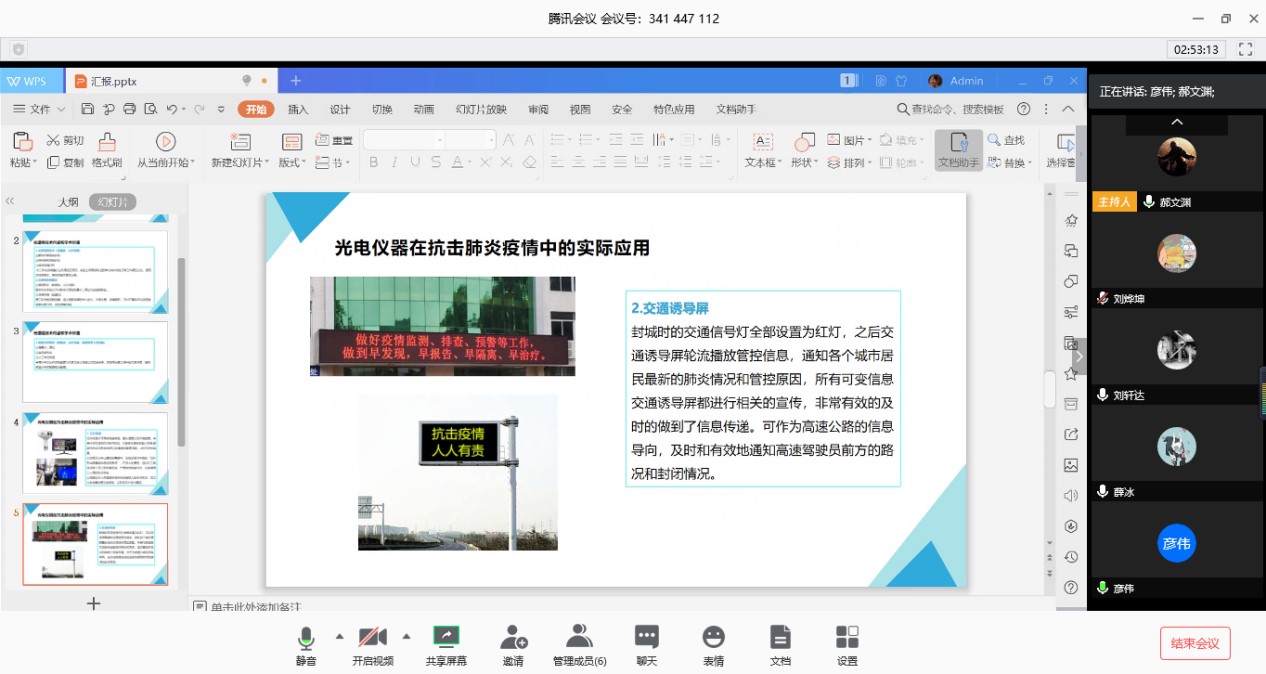 光电技术离不开现实的应用,故而研究生培养要与时代课堂紧环相扣。针对光科学与工程中心(OSEC)团队国家自然科学基金、军装发领域基金、省基金、重点实验室基金所涉及到的和新冠疫情相关的科学问题、关键技术通过本次腾讯会议进行云端交流。