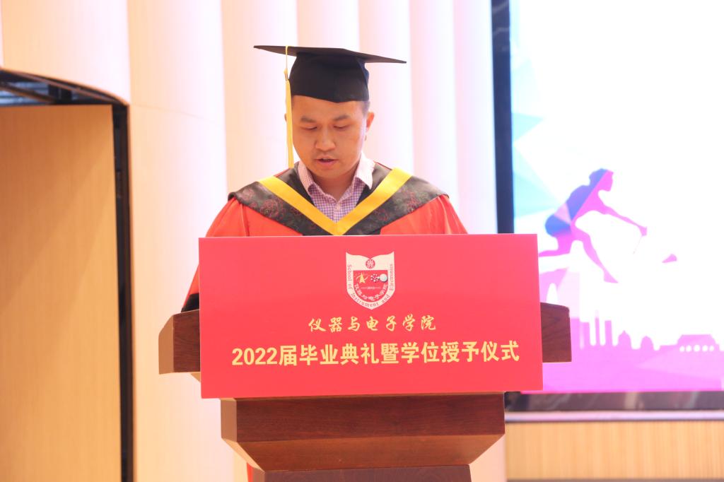 副院长唐军宣读学位获得者名单。毕业研究生代表关一浩和毕业本科生代表安琪分别代表毕业生们向学校和辛勤付出的老师们致以诚挚的感谢。