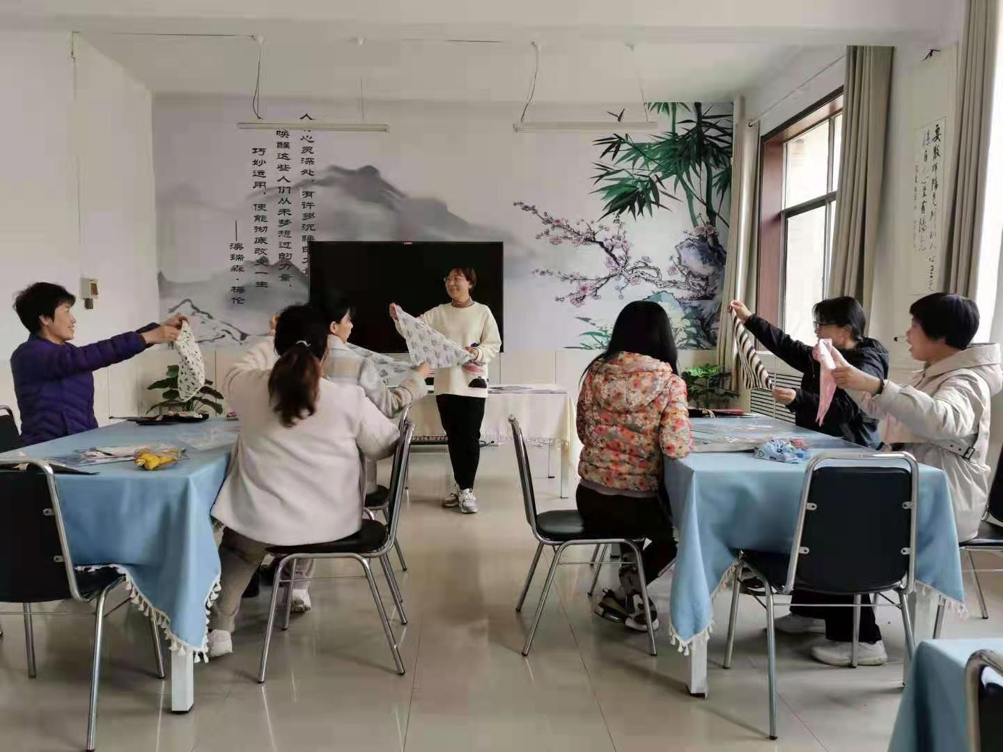 的女教工们学习一年四季系丝巾的方法。美丽的丝巾在大家的指间变成一道道风景,扮靓了阳春三月。欢声笑语在工作室久久飘荡。