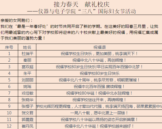 “接力春天,我为校庆送祝福”活动得到女教工们的积极响应。大家纷纷通过网络在线接力的形式送上对学校八十校庆的祝福。“祝福中北八十华诞,再创辉煌”、“百年百强,赓续辉煌”、“祝愿母校勇创一流”……美好的祝福在属于妇女们最美好的节日里汇集成为学校发展的蓬勃力量。