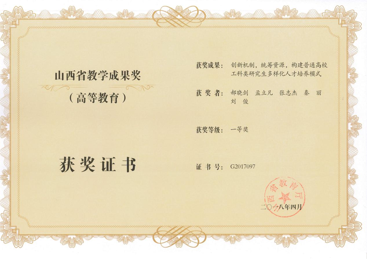 2017年山西省教学成果奖(高等教育一等奖):创新机制,统筹资源,构建普通高校工科类研究生多样化人才培养模式