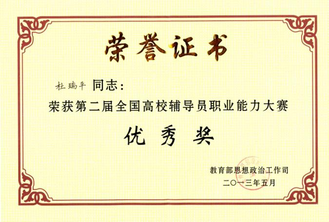 杜瑞平2013年5月荣获第二届全国高校辅导员职业能力大赛优秀奖