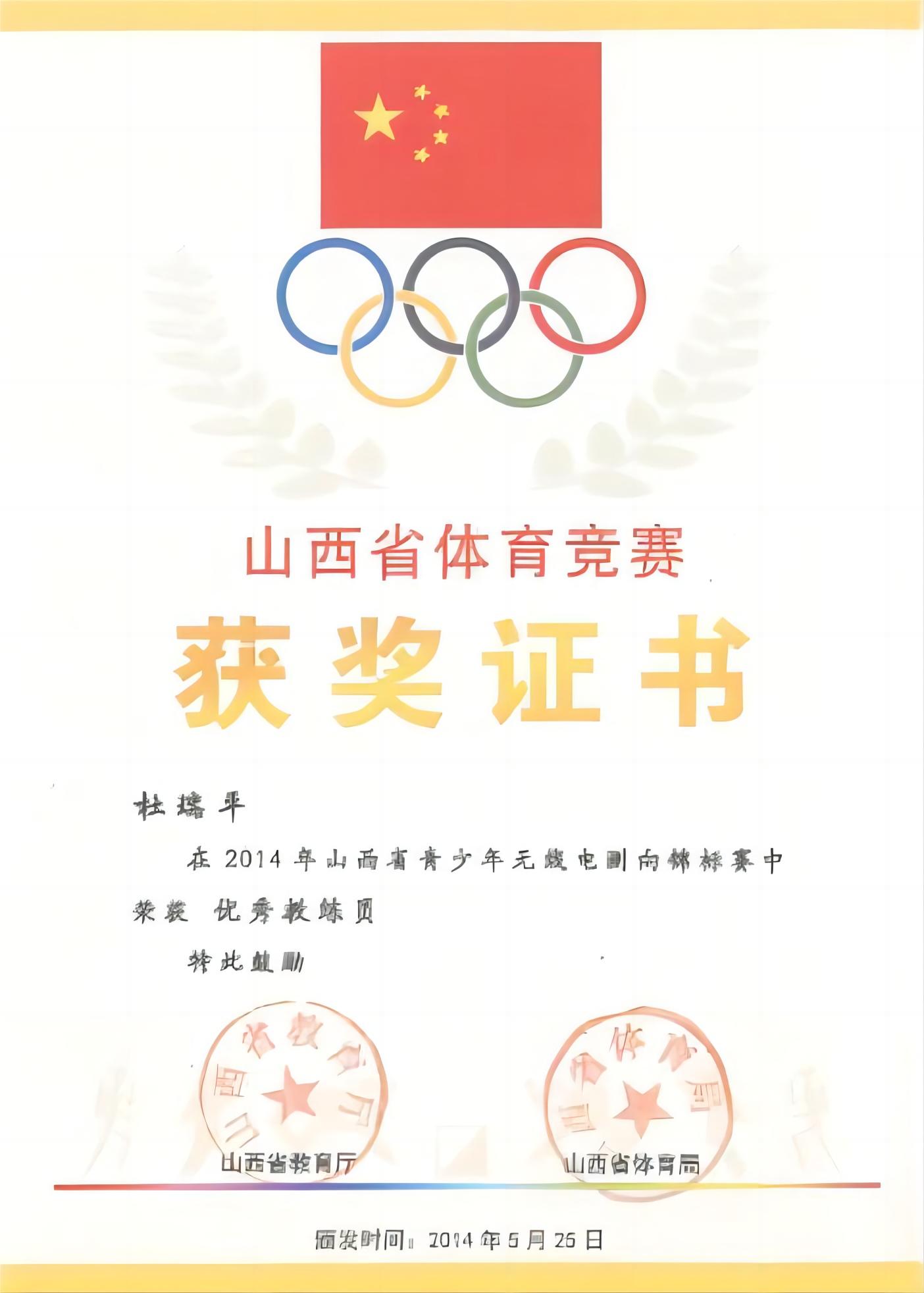 杜瑞平在2014年5月山西省青少年无线电测向锦标赛中荣获“优秀教练员”