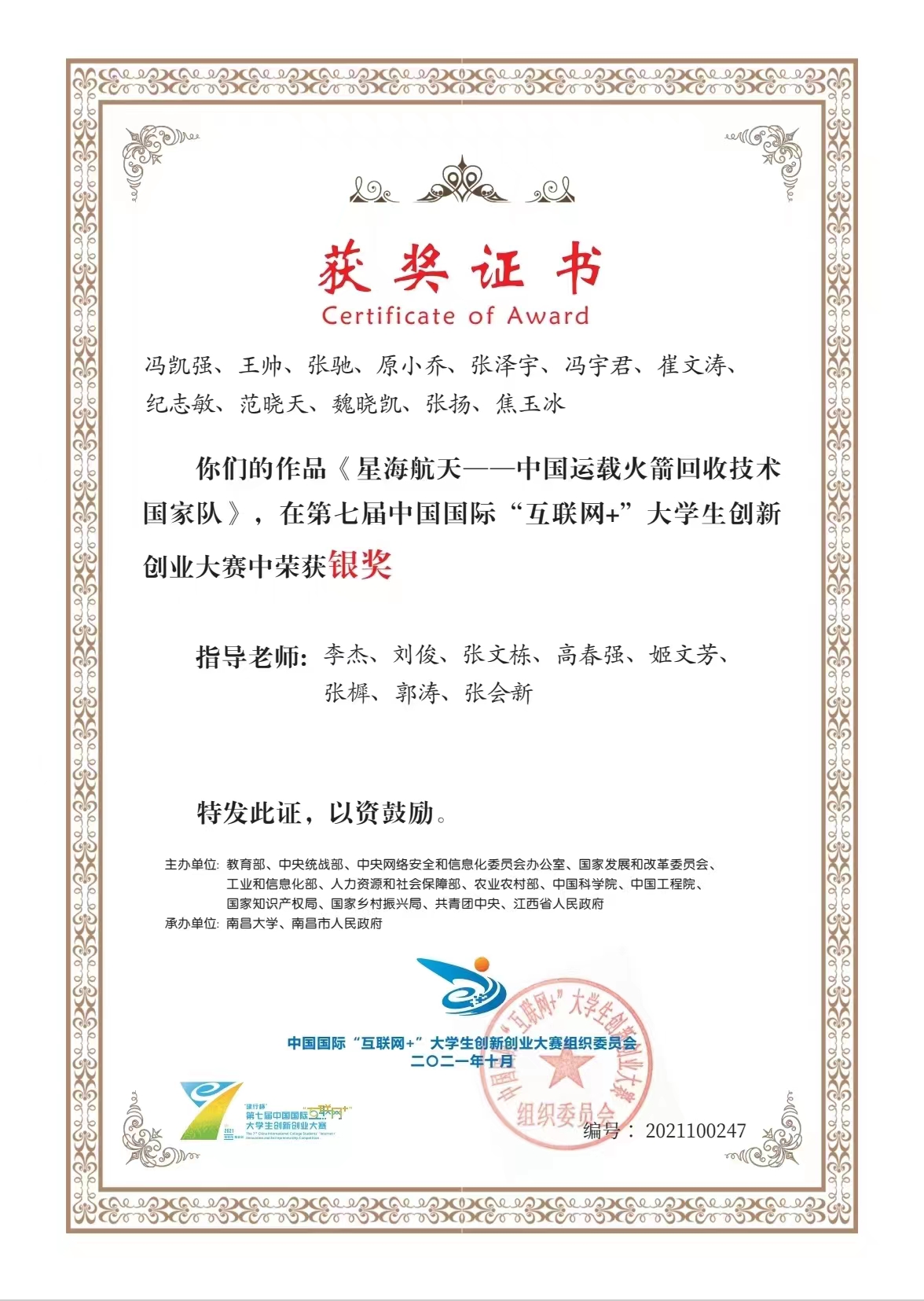 2021年“星海航天——中国运载火箭回收技术国家队”队伍在第七届中国国际“互联网+”大学生创新创业大赛获得国家级银奖