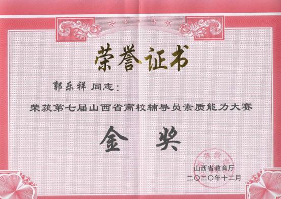 郭乐祥2020年11月荣获山西省第七届高校辅导员素质能力大赛金奖