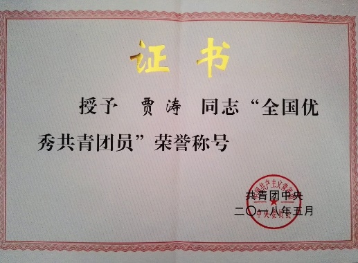 2018年贾涛同学获“全国优秀共青团员”荣誉称号