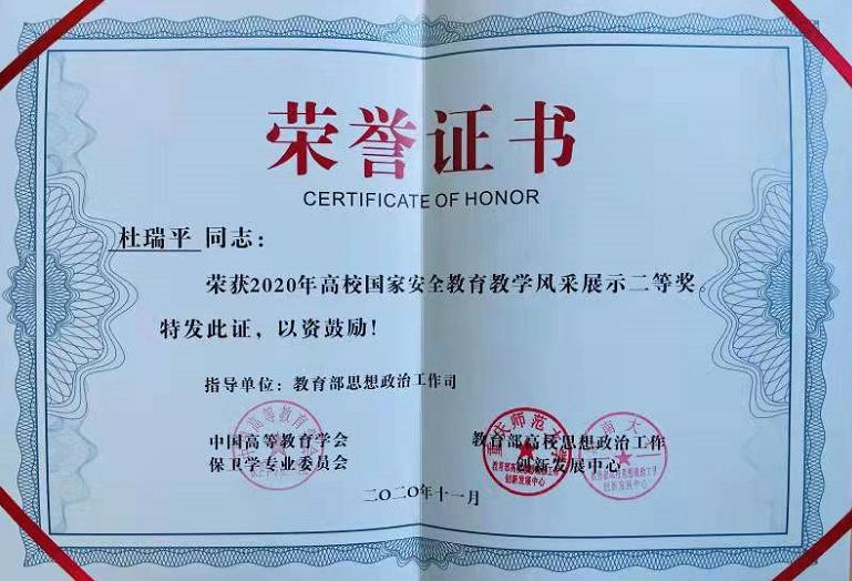 杜瑞平2020年11月获高校国家安全教育教学风采展示二等奖
